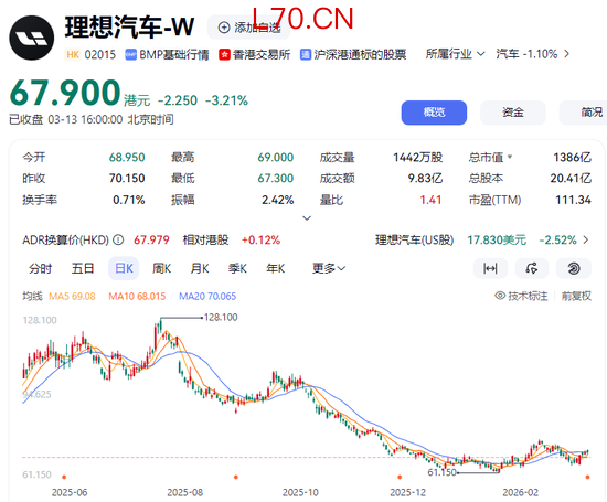 销量承压下,理想股价也从去年7月以来便持续下跌,目前股价已经跌至67.9港元,相较128.1港元的高点已经跌去了47%,几乎“腰斩”,市值蒸发超1228亿港元。