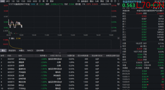 吃喝板块今日(3月19日)随市回调。反映吃喝板块整体走势的食品饮料ETF华宝(515710)开盘后持续低位震荡,截至发稿,场内价格跌0.71%。