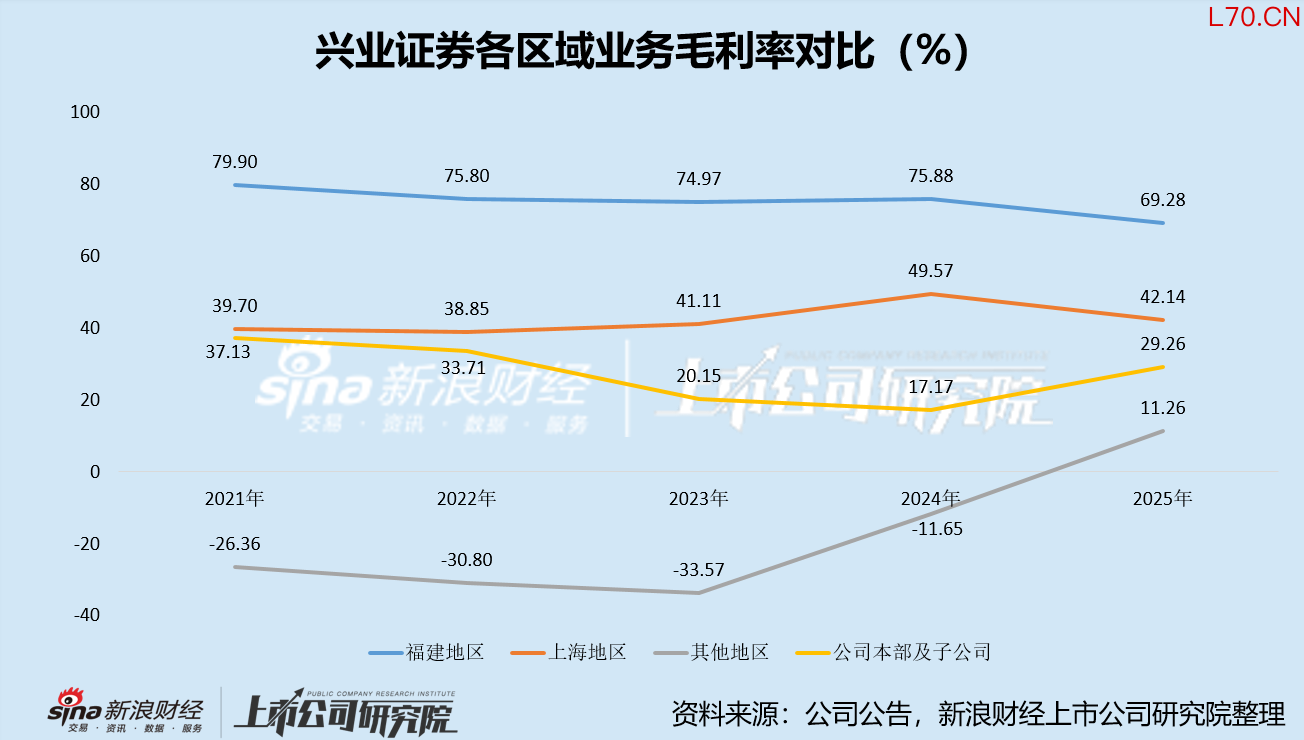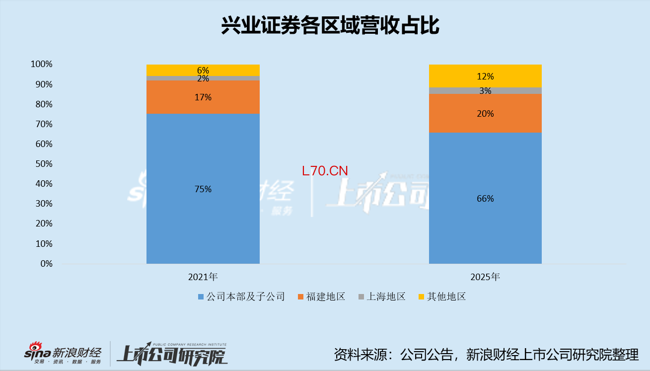 而从核心利润来源的角度看,兴业证券耕耘五年,也未真正走出福建。截至2025年,其来自公司本部及子公司、福建地区的营收占比仍高达85%,来自上海地区的营收仅占3%,来自其他地区的营收占比12%,省外市场的开拓节奏较慢。