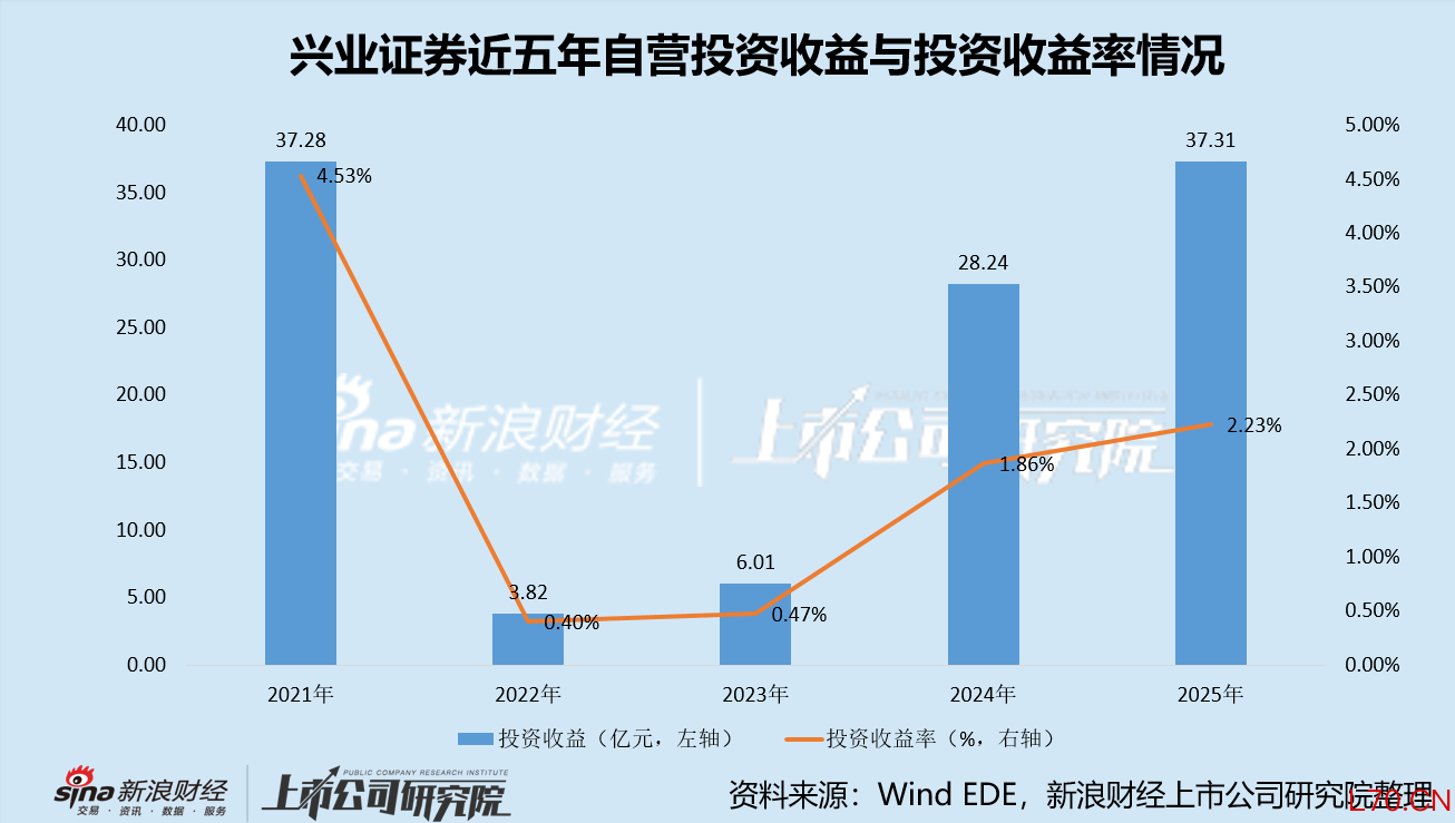 2023年到2025年间,兴业证券交易性金融资产中,股票占比分别约为16%、11%、5%,股票持仓持续压降,即使面对2025年市场大行业也未有增配动作。在该策略之下,兴业证券投资收益率表现不佳,2023年到2025年分别为0.47%、1.86%、2.23%,分别位列行业倒数第四、倒数第七、倒数第三。