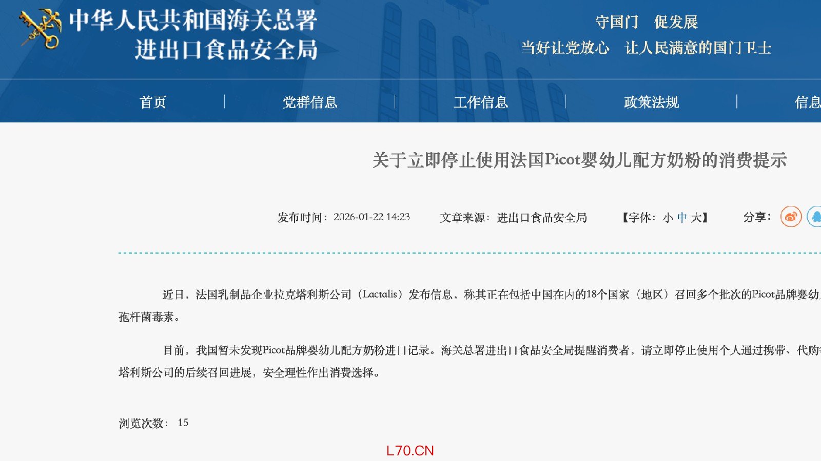 国家海关总署:立即停止使用法国Picot婴幼儿配方奶粉