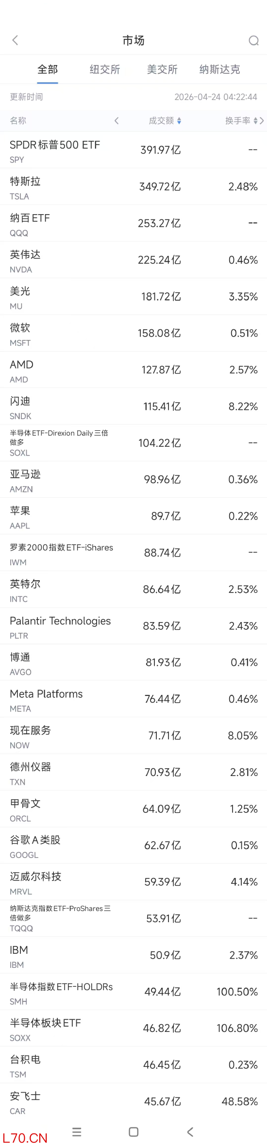 第6名闪迪收跌4.76%,成交115.41亿美元。闪迪近日正式推出全新一代SANDISK Extreme PRO CFexpress 4.0 Type B存储卡。该系列产品全面采用PCIe Gen 4接口标准,顺序读取速度最高达3700MB/s,写入速度最高达3500MB/s。