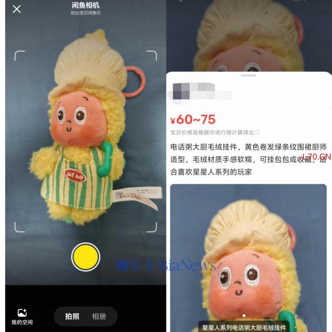 以一件闲置星星人挂件为例,拍摄完成后,系统自动识别出“毛绒挂件”品类等信息,并生成“电话粥大厨毛绒挂件、可挂包包或收藏、适合喜欢星星人系列的玩家”等描述文案,同时给出60-75元的商品行情价,并同步展示在闲鱼空间完成上架。