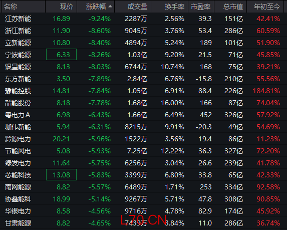 电力股早盘走弱,江苏新能、立新能源、宁波能源等多股跌超 8% 。