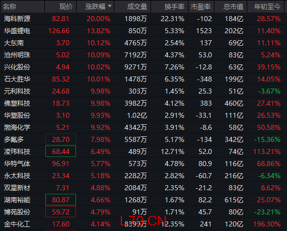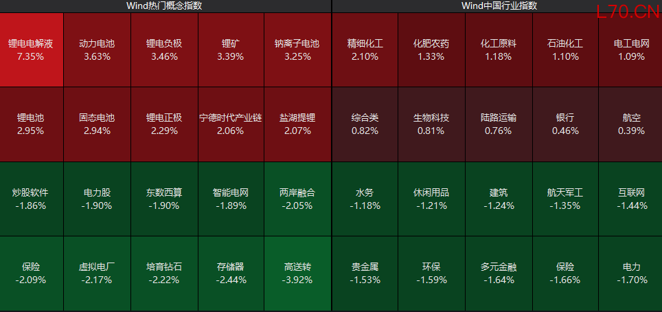 从板块看,化工板块持续走高,锂电概念股集体走强,而电力、贵金属、多元金融等板块跌幅居前。