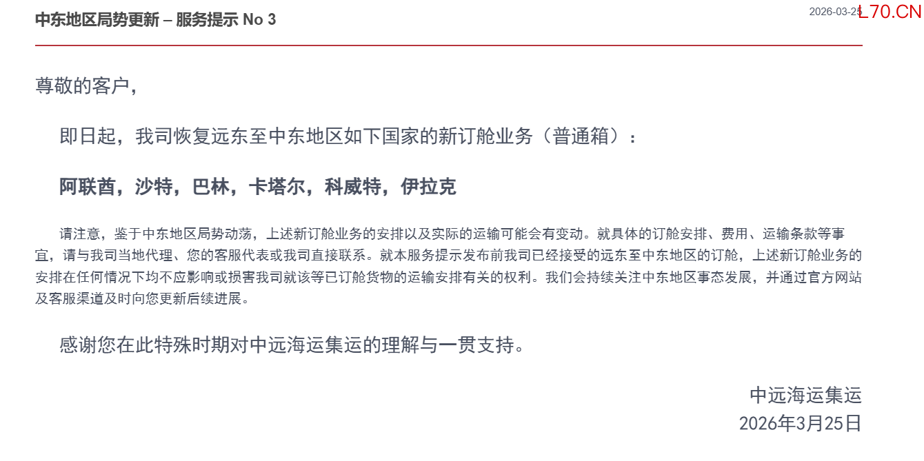 中远海运集运:即日起恢复至阿联酋,沙特,巴林,卡塔尔,科威特,伊拉克的新订舱业务